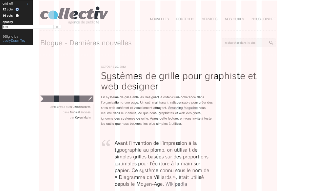 Un système de grille aide les designers à obtenir une cohérence dans l’organisation d’une page. C’est maintenant un outil indispensable pour créer des sites web cohérents et visuellement attrayants. Smashing Magazine détaille dans leur article tous les détails que que nous, graphistes et web designers, ou vous, clients intéressés par le processus de fabrication d’un site web, pouvons apprendre des systèmes de grille.